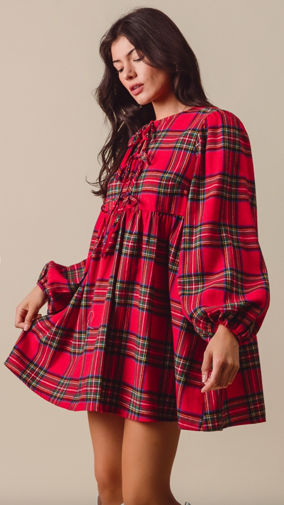 Turn heads in this bold red plaid mini dress that commands attention. The classic checkered pattern delivers timeless edge, while the front tie detail cinches your silhouette for a flattering, customizable fit. Round neckline keeps the look effortlessly chic without competing for focus.